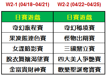 1. 活動期間,玩家遊玩指定日賽遊戲(如下表)不限單筆押注額,每投注或中獎1金幣=1積分(含副遊戲),達成積分排名名次即可獲得對應獎勵,各遊戲分別以排行榜計算,每日00:00重新計算積分。