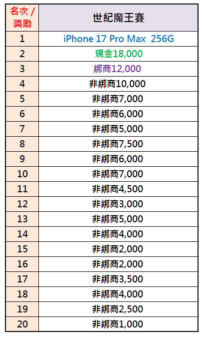 2. 八日賽排行榜分為「一般賽」&「世紀魔王賽」,500等以下玩家參與一般賽,500等(含)以上玩家參加世紀魔王賽。